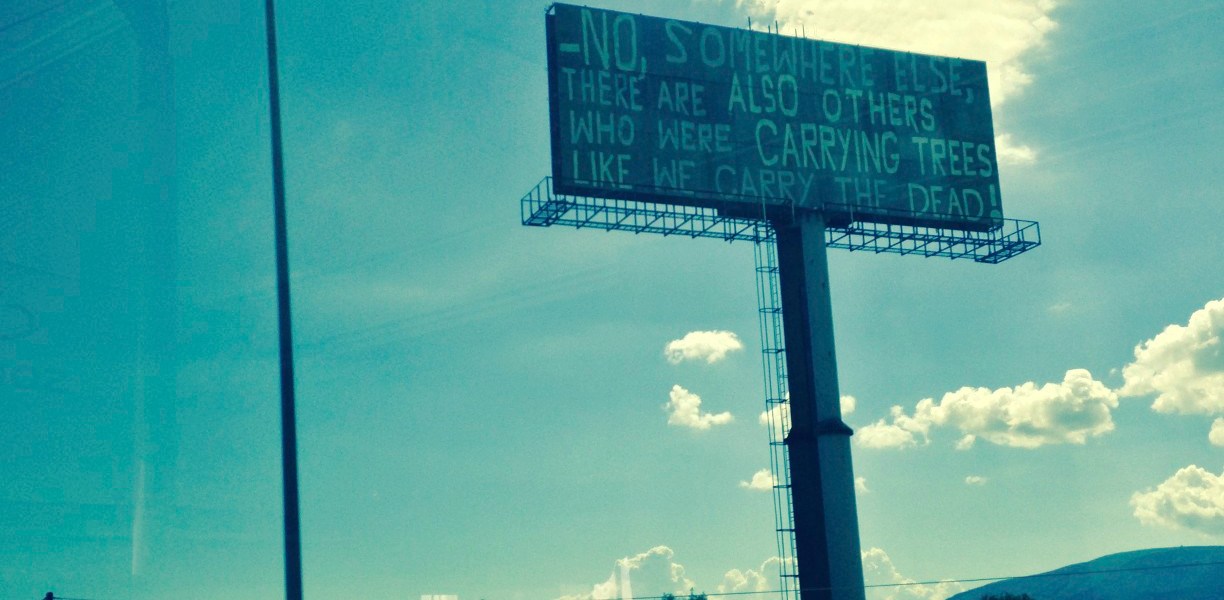 The board was very striking, but the categorical opener ‘No,’ particularly so. A ‘no’ alone, before its comma pause, wilfully stranded. A ‘no’ perhaps to where you are, which is on the road, in transit, en route, moving decisively within your world, between your origin and your destination. The stumbling but assertive capitals went on to point out that somewhere else some alternative is also as much a world, a world in which there are those who are other to you as you might be other here sometime, even for a moment now, suddenly wavering in your own world. But the fractured English also produces an ambiguity. The board also says that this somewhere else is in fact already right here, your world, as if the words were a legend told among those who carry their dead like we industriously carry trees: ‘Trees instead of bodies. Imagine. Let’s go.’ As if it were post-apocalyptic sci-fi dialogue, ‘There also also others’, survivors, somewhere else, another world. And it is your world. You are a survivor, and you do not even know it.